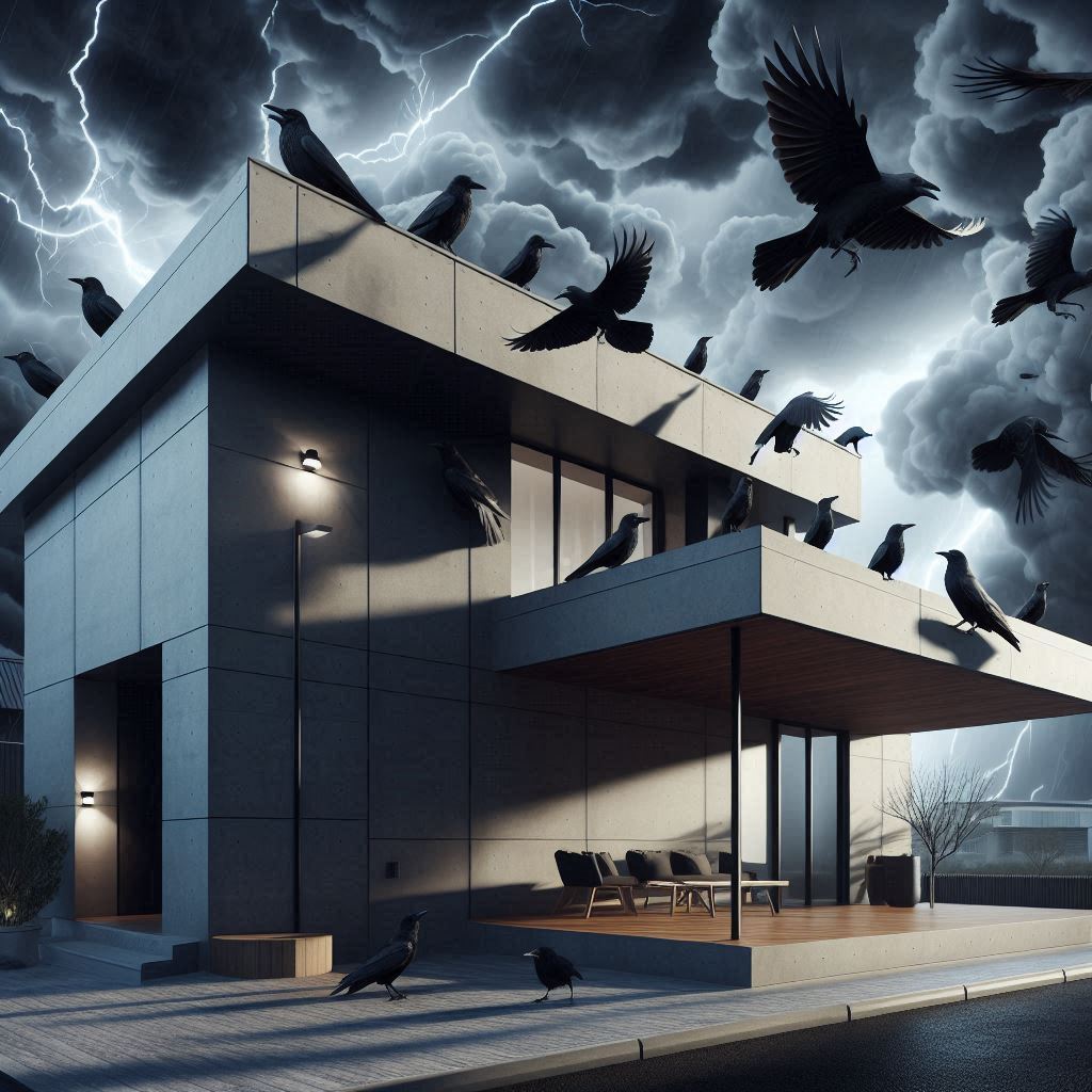 Alfred Hitchcock’s muse, murder gathers on roof tops. Crows screech, caw loudly.