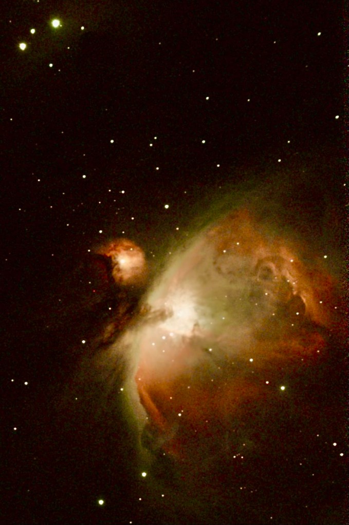 Photo by John McKaveney. The Orion Nebula: “This is an active star forming region about 1400 light years away, of condensing gas and dust, illuminated by newly forming stars. Our solar system formed in a region much like this about 5 billion years ago. The photons that were observed when this picture was taken, left the nebula in 624 AD. At that time, Mohamed had just won the Battle of Badr, in Saudi Arabia, the classical period in Europe was ending and the middle ages beginning, the Mayas were just beginning to build their largest pyramids, and Europeans had not yet set foot in North America. Throughout this entire time, those photons of light were traveling through space to be captured to form this photograph, where their journey finally ended.”