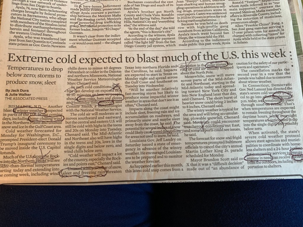 I’ve done a “blackout poem” from an article about the weather in the San Diego Union Tribune, Sunday January 19th edition. See photo below …circled words are the ones I’ve used to create the poem….using them in the order in which they appeared in the article.