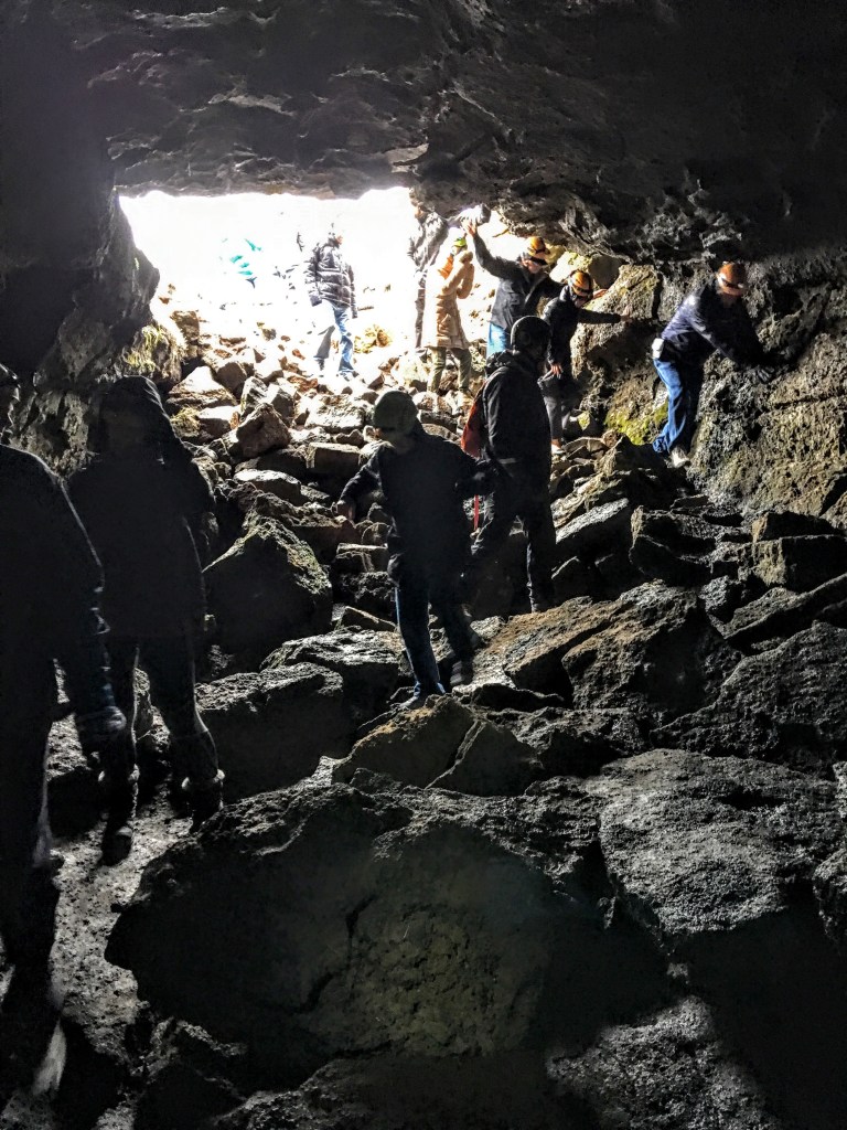 An hour later, we donned hardhats with headlights; no sticks allowed. Our guide took us to explore a 2,000 year old lava tube. Once a conduit for flowing molten rock, the channel crusted over forming a tunnel which we gingerly entered. We inched over boulders, slid down slabs, and crawled our way through parts of this damp, dark hollowed out place. Our headlights revealed pockmarked, cracked, uneven walls and lavacicles that hung from the ceiling. We came upon misshapen lava pillars impeding forward progress, thus marking our turn-back point. By the time we clambered out of the tube, my body was chilled to the bone and I was exuberant to feel the sun.