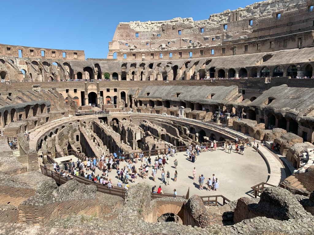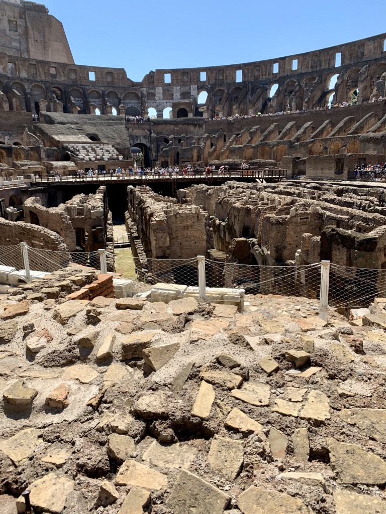 Yes, these are PHOTOS from July when we were on our month-long trip. First stop was Rome and its antiquities. We had a day’s tour with an archeologist which began with an extensive visit to the Colosseum. Everything I’ve written about here is what it was like back in the day! And yes, you can still see the original XXXIII on the archway where folks who had seats in this area entered. The photo bottom left shows part of the floor rebuilt, and you can see the circular shape with the tiers of seats. Photo bottom right shows the partitioned off “rooms” or “cells” where the animals were kept. And yes, there were trap doors in the floor and animals were raised up to suddenly appear on the colosseum floor. It turns out that animal to animal fights were always to the death of at least one animal. Animal to prisoner would most likely end in death to the prisoner. But the real gladiators, unlike in the movies, who fought here, never fought to the death. There was an adjudicator who called the contest and named a winner. The gladiators were actually slaves and had a “school” literally across the road from the colosseum where they trained by day and were locked in their cells by night. As slaves, they were a business investment, owned by wealthy people. When you learn that, you understand why they didn’t fight to the death. Some slaves had the opportunity to earn their freedome by winning X number of battles. Sometimes they managed to do that, but not often. An incredible place to see. Construction on the Colosseum, the largest amphitheater ever built, began in 72AD and was completed in 80 AD. It held 50 to 80,000 people. And there was indeed a “gladiator school” across the road. There was daily entertainment here, provided to the citizens free of charge, and sponsored by the Emperor.